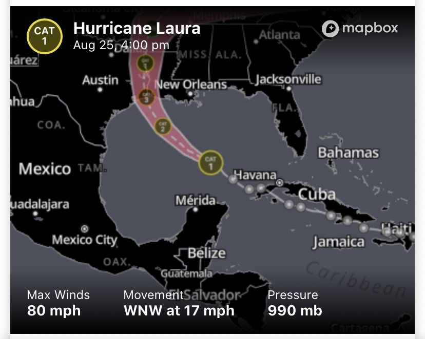 This storm is so bad that it will be a Cat 1 or a tropical storm when it gets to Shreveport. A lot of people I love live there — it’s my hometown. As far as I know, this is unprecedented. Haven’t we had enough unprecedented crap this year?