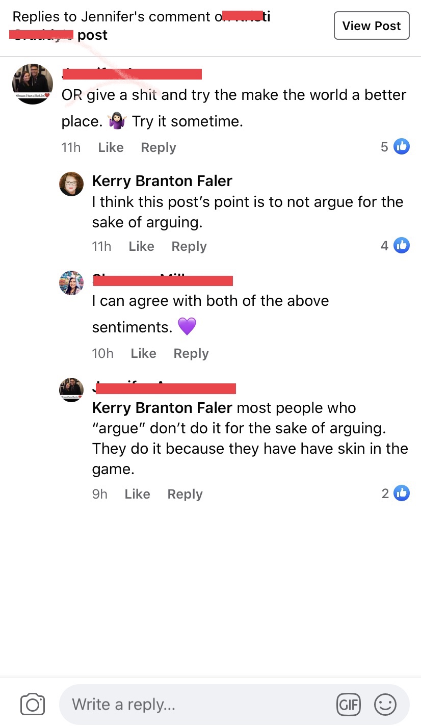 I’ve seen a million COVID-19 posts with a million comments. If someone thinks everyone should wear masks, someone thinks they don’t work or that get will get carbon dioxide poisoning from breathing in their masks (yes, they think that). People think it’s a conspiracy from China. People think everything should be open or not at all. People think they are the ones who have to comment on every post no matter what.