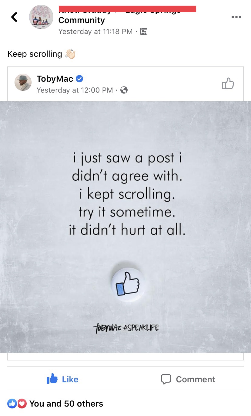 I was on the old Facebooks last night and a woman posted a good graphic about not commenting and just scrolling through posts. I had to comment after this peach of a woman commented, then she tried to bait me. I didn’t fall for it.